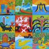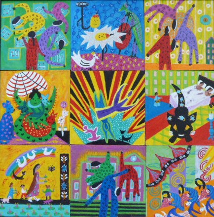 Acrylique sur isorel - Dimension 15"H x 15"L - Mosaïque 9 tableaux 5"H x 5"L - ( non encadré ) - Acrobats - Reflecting the Music - Acrobats II - Green Doll with Cats - Hallelujah - Cat and sleeping Couple - Carrying Candle Lithts - Acrobats III - Jewish Tune
