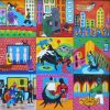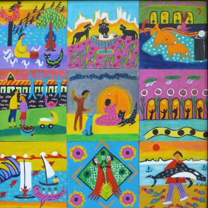 Acrylique sur isorel - Dimension 15"H x 15"L - Mosaïque 9 tableaux 5"H x 5"L - Red Rooster - Three cows watching a baby - Two orange horses -Basket of apples - 6 June 2012 - Five Dancers - Pink Whale - Handkerchief - Carrying a fish - ( non encadré ) - ( année 2012 )